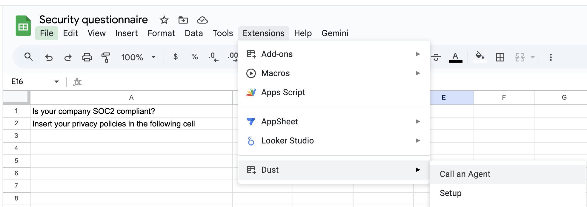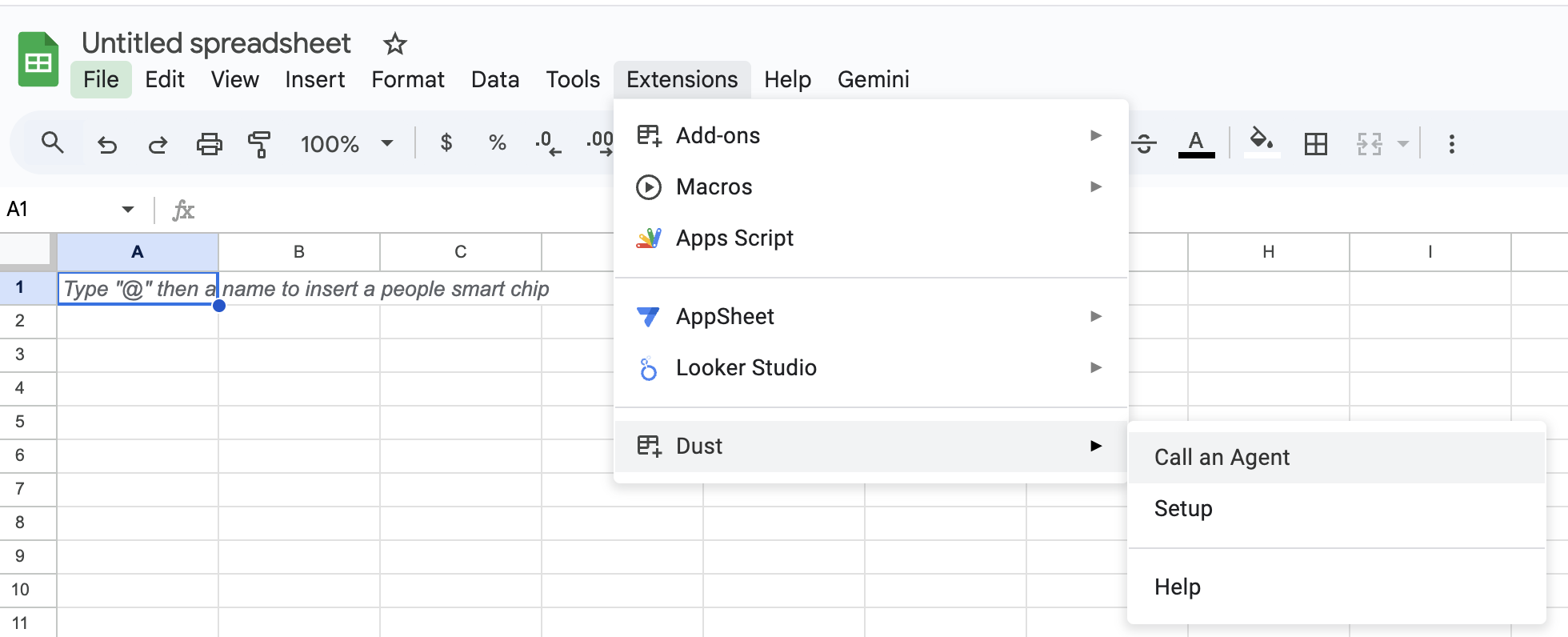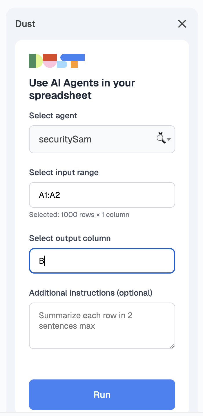The Dust Google Sheets Add-on brings the power of your Dust agents directly into your spreadsheets. Process data, analyze information, and automate tasks - all without leaving Google Sheets.