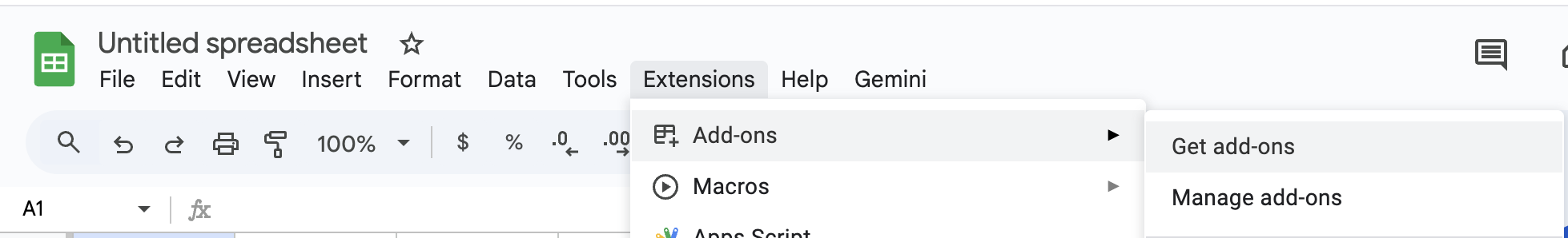 From any spreadsheet, visit the Google Workspace Marketplace by navigating to Extensions > Add-ons > Get add-ons