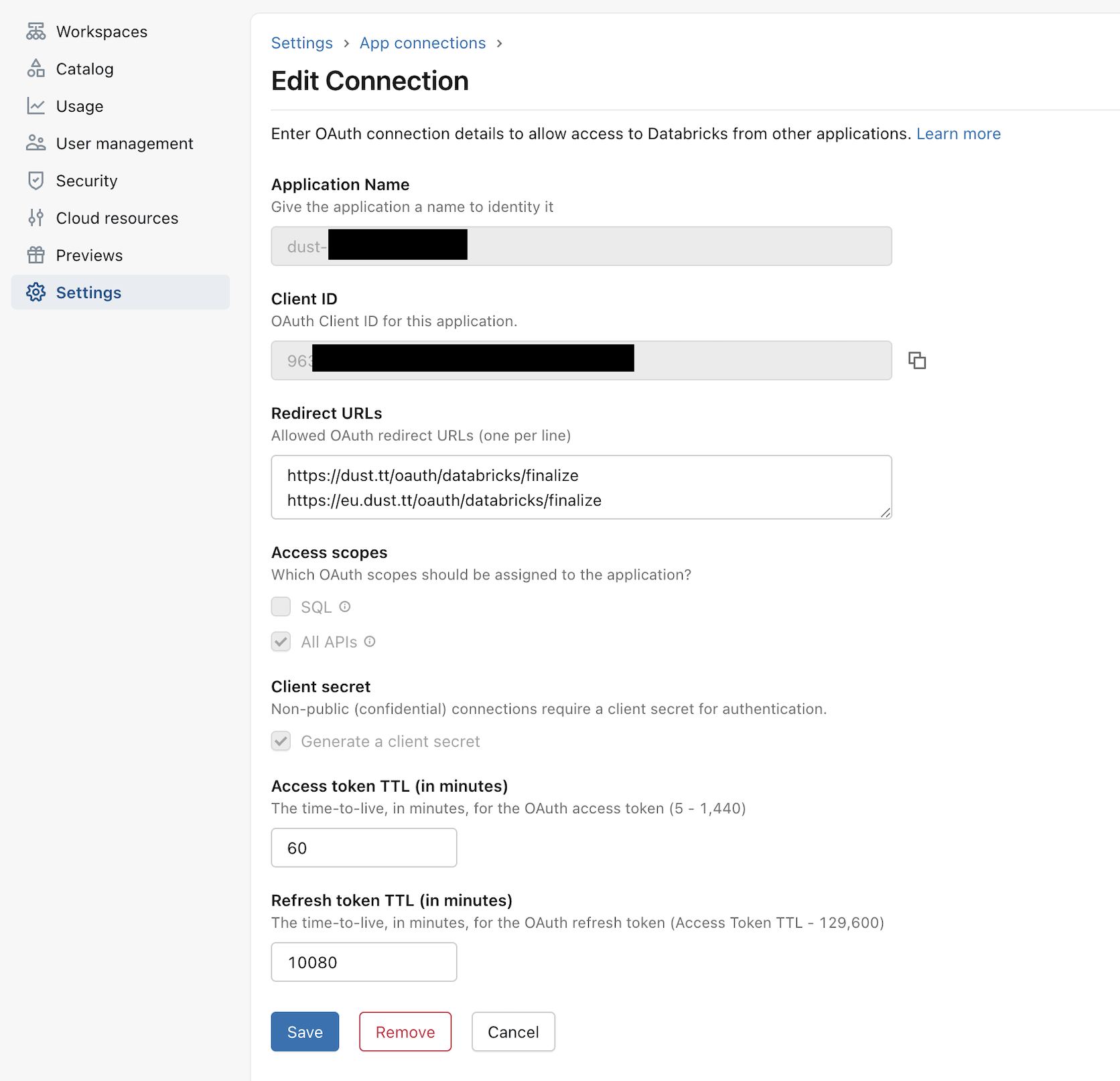 https://[your_workspace_url].cloud.databricks.com) - Client ID: The Client ID from your Databricks app connection