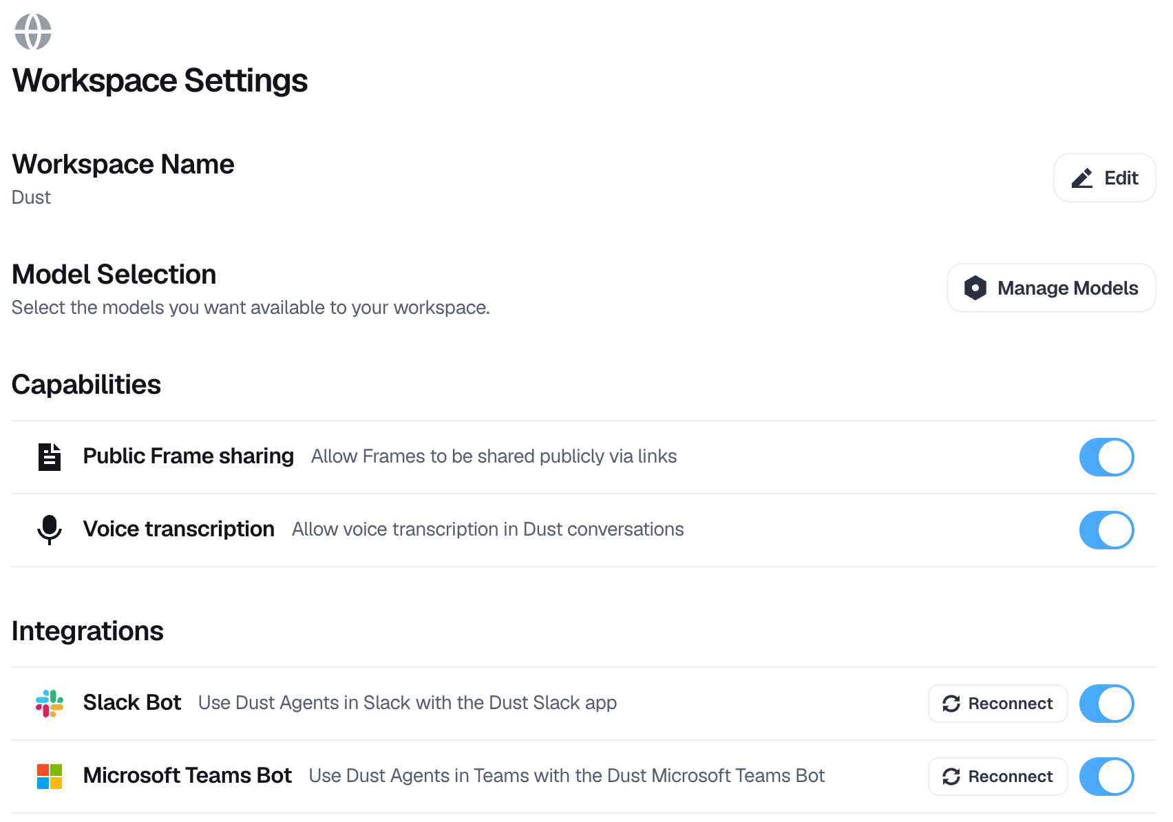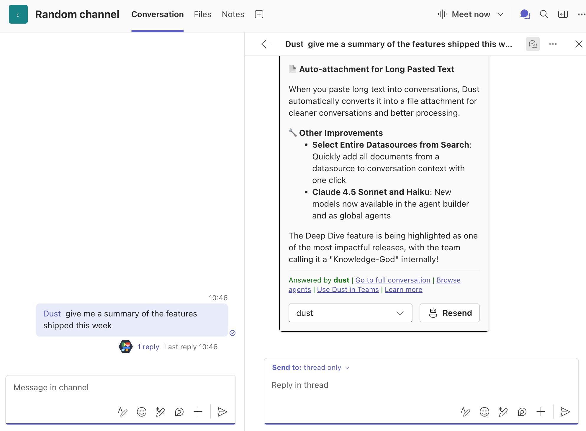 Integrate your Dust AI agents directly into Microsoft Teams channels and conversations. Agents will have the context of the conversation and can collaborate with your team members in real-time.