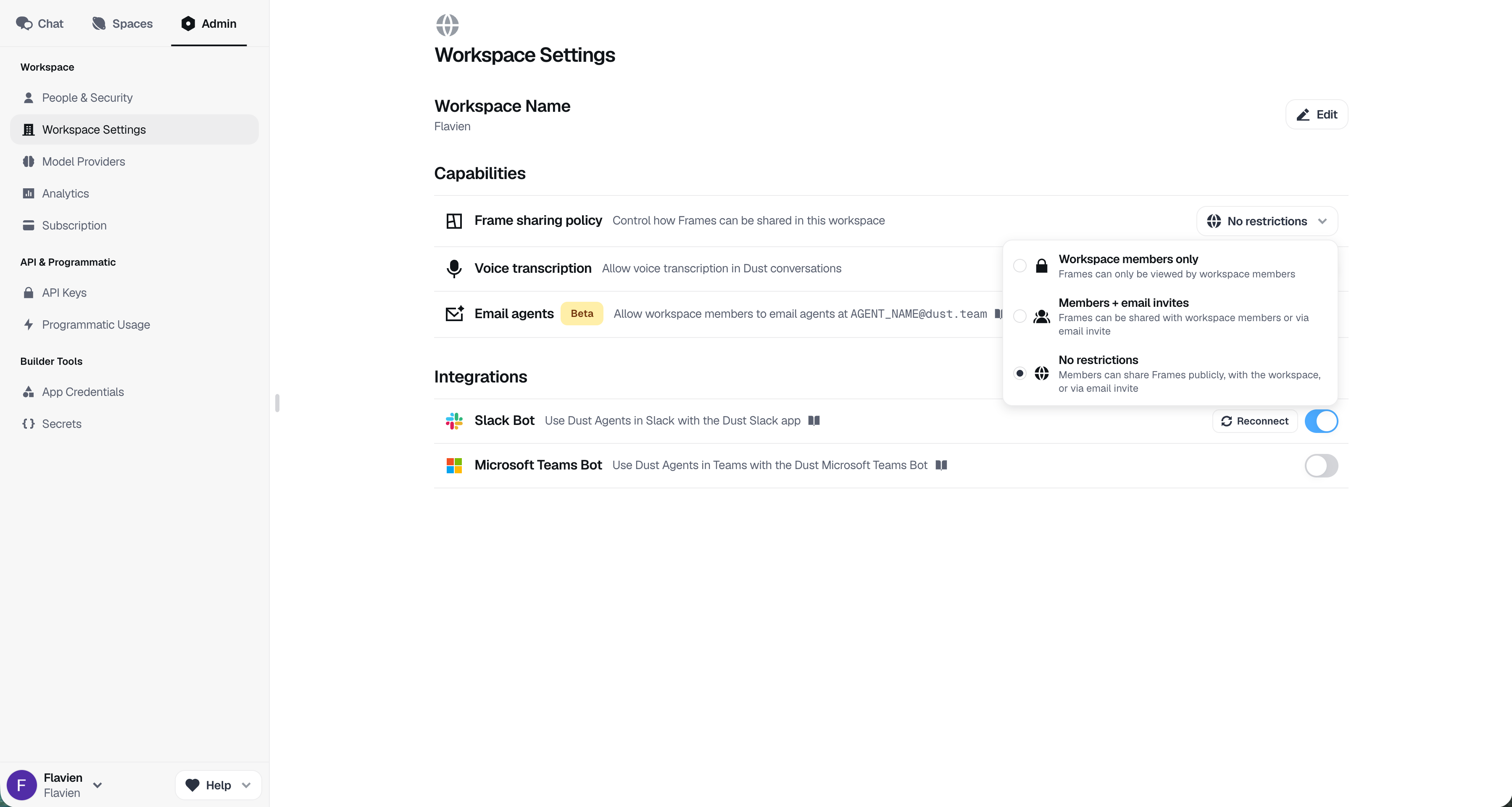 Workspace admins can control how Frames can be shared by members of their workspace. These settings determine the sharing options available when users share Frames.