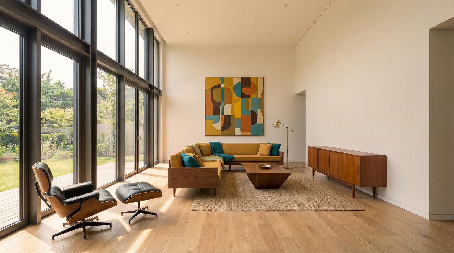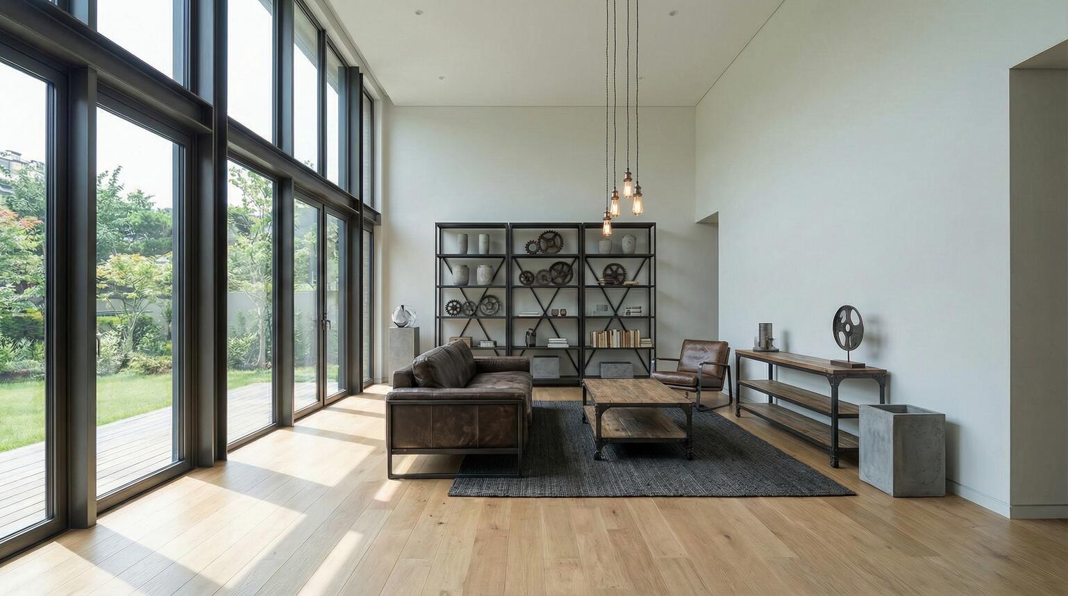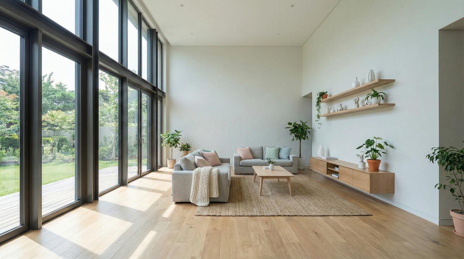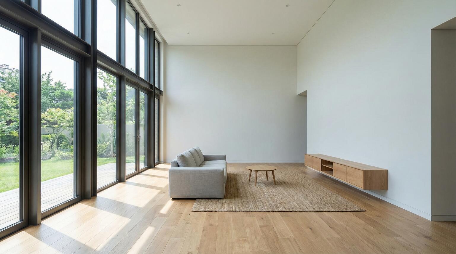 1. Base room: modern minimalist living room with large windows, hardwood floors, neutral colors, architectural visualization style