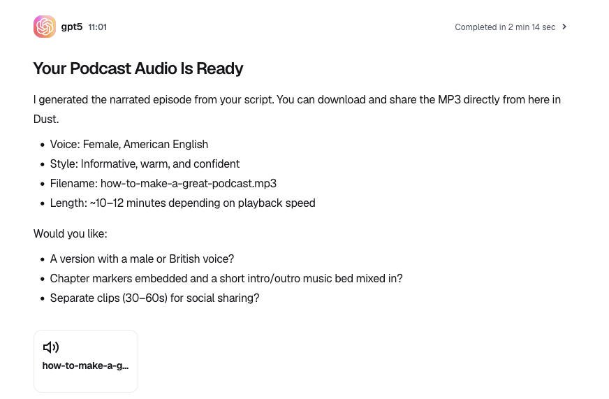 | Podcast | Generate a podcast from a prompt which will match your company's tone of voice and intonation |