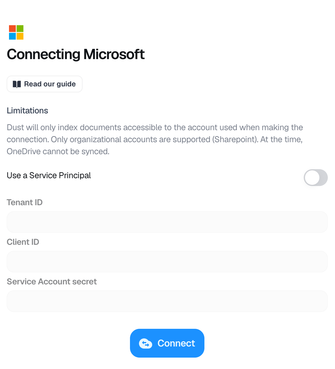 You can connect Dust to your Microsoft suite to enable access to the documents, spreadsheets, and presentations hosted in your Sharepoint drives. Only the content within the scope of the admin's Drive permissions will be available in Dust. The admin can granularly select the exact data they want to make available to Dust.