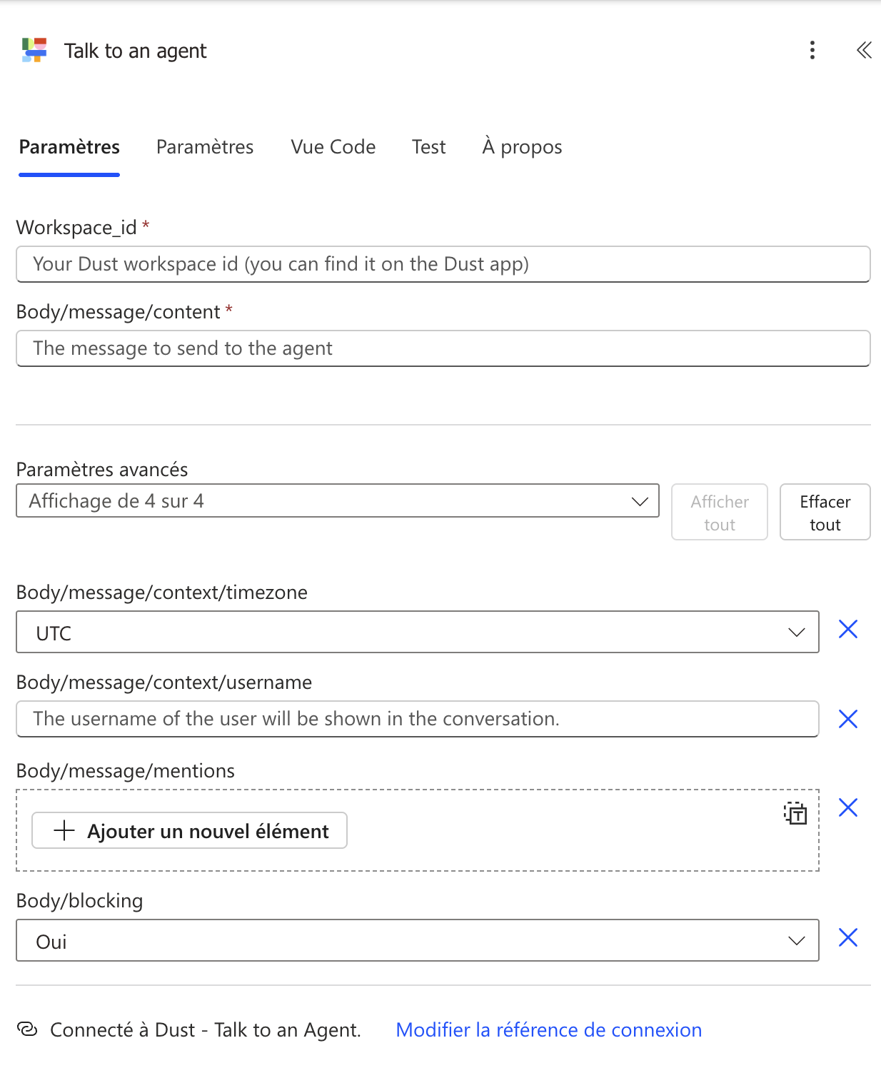 - Select the Dust connector you want to use (either Talk to an Agent or Upload document)