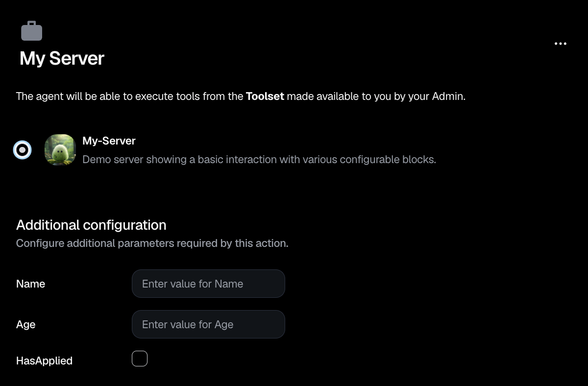 On the click of the Add MCP Server button, you'll only have to enter your server's URL, and after a quick synchronization, your server will be created and ready to be added, as a toolset, to your agents.
