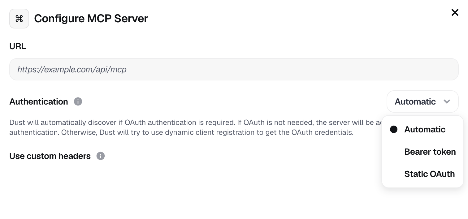 In most scenarios, the Automatic option will discover all required configurations from the URL provided, trigger an OAuth login flow and finish the configuration automatically. This is the recommended, most secure way to authenticate to MCP servers.