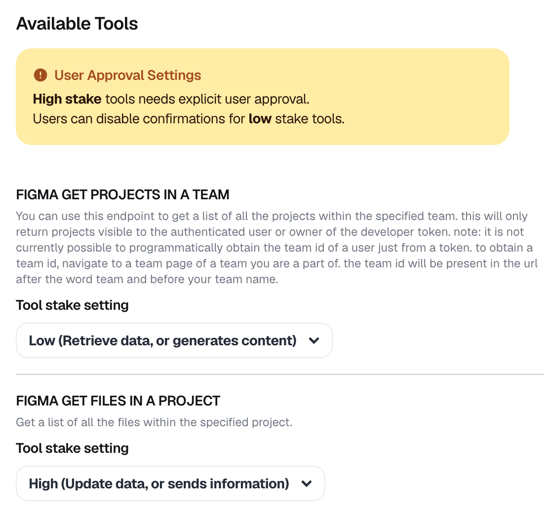 MCP Servers can give a lot of different capabilities to your agents, and we feel like your users needs to realize what is happening under the hood. That's why we implemented a "Stake" level for every tool, of each toolset. Two levels exists :