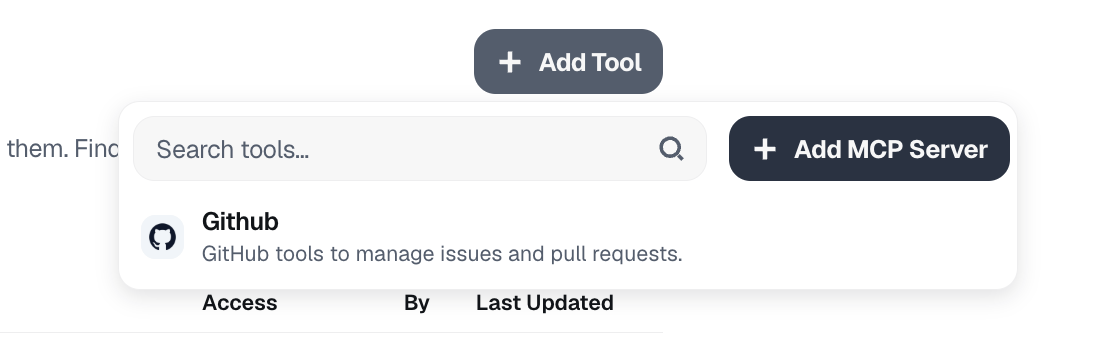 As an administrator, you can add a Remote MCP Server to your workspace. To do so, go to the Tools section of the Knowledge Tab. Here, you'll find an Add Tool button.