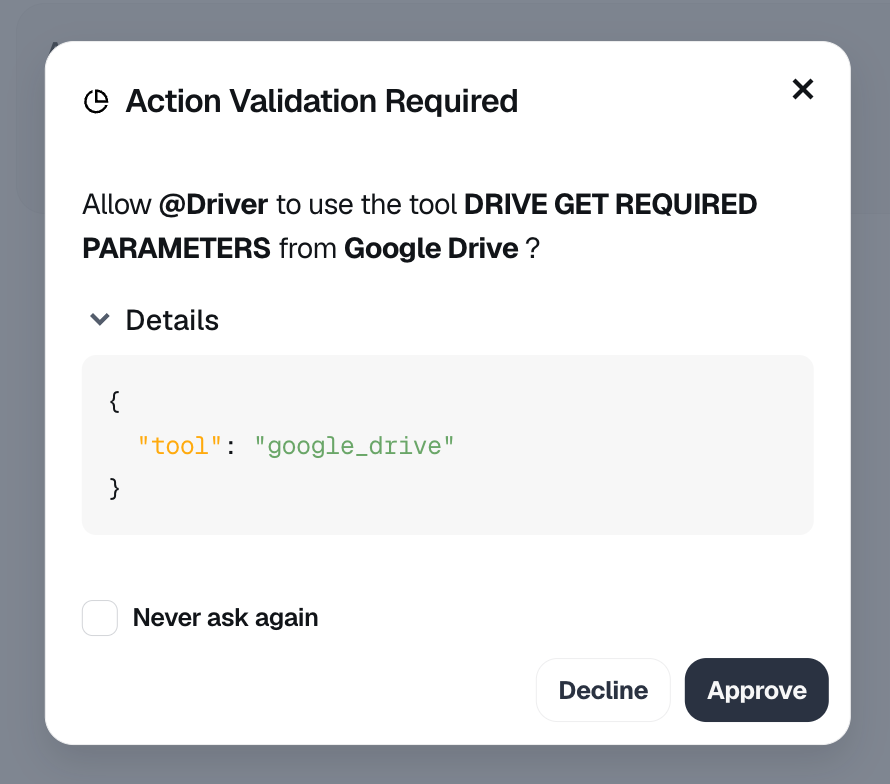 A High stake action will always trigger a validation pop-up when the tool is used. The user will need to acknowledge the use of the tool by the agent. A Low stake action can be silenced by the user at their own will. Once they silence the tool, they won't see the validation pop-ups anymore, and the action will execute automatically.