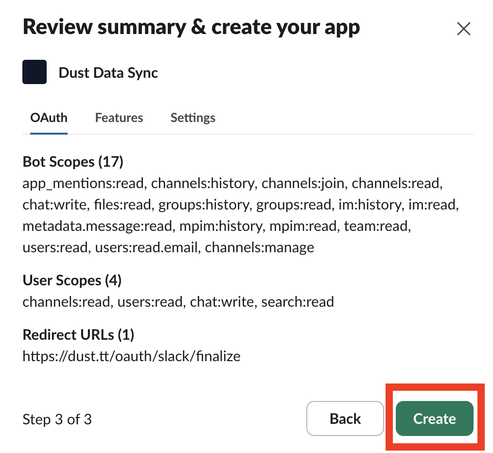 Avoid editing your slack app after setupOnce your Slack app is created and connected to Dust, editing some of the app parameters can break your connection. In particular avoid: