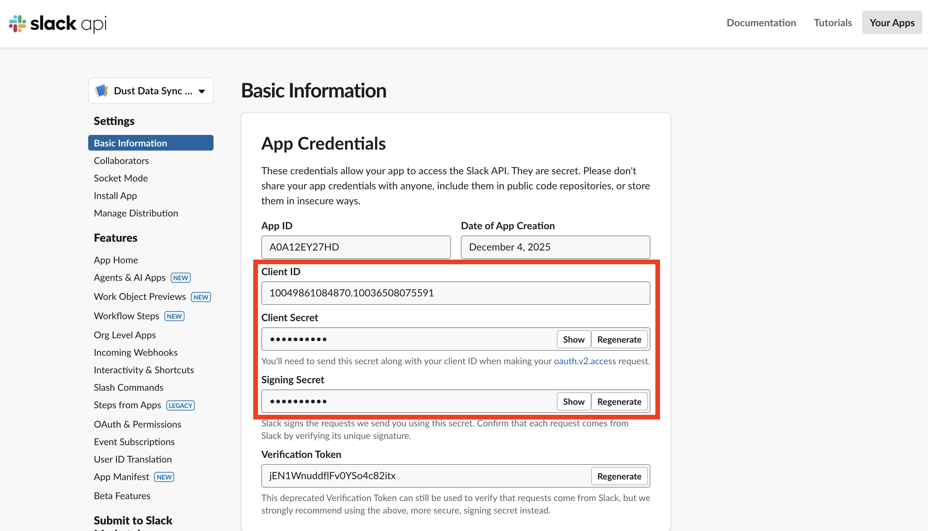 - Enter the three credentials (Client ID, Client Secret, Signing Secret)