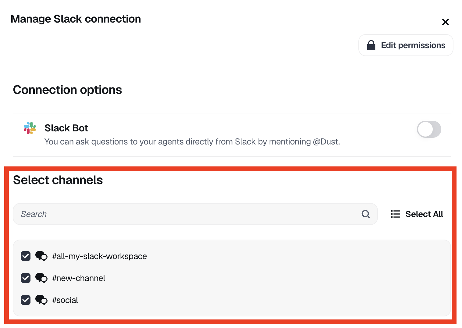 - Admins can update permissions directly from the Slack connection in Dust by clicking on