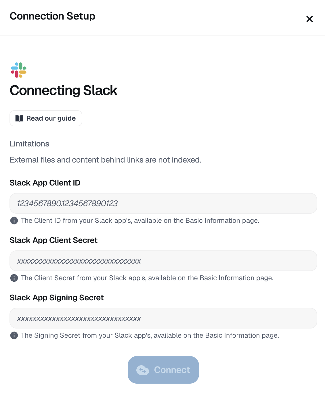 - If you have never setup your Slack connection, simply follow the setup guide below to create your Slack app before connecting